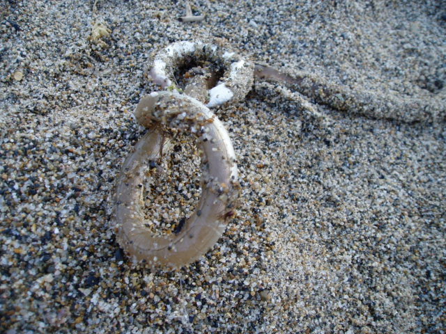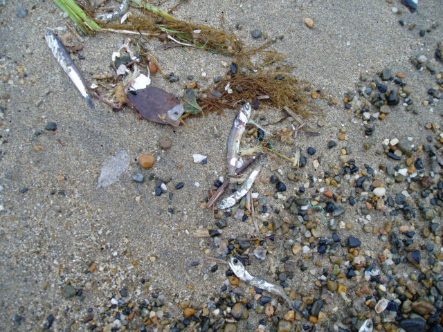 所々に4~5cmほどのカタクチイワシの稚魚が打ち上げられている。